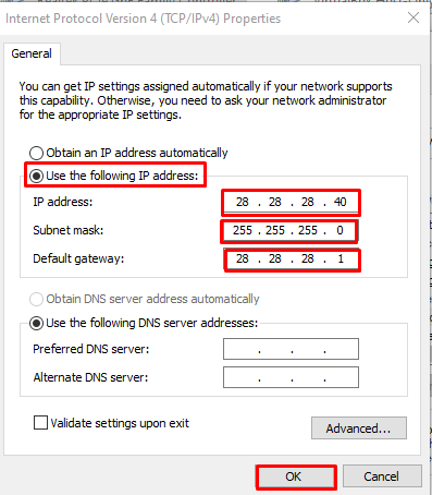 3. Kemudian lakukan konfigurasi ip address secara manual pada laptop client, pastikan menggunakan network yang sama dengan Router-01 seperti gambar dibawah ini
